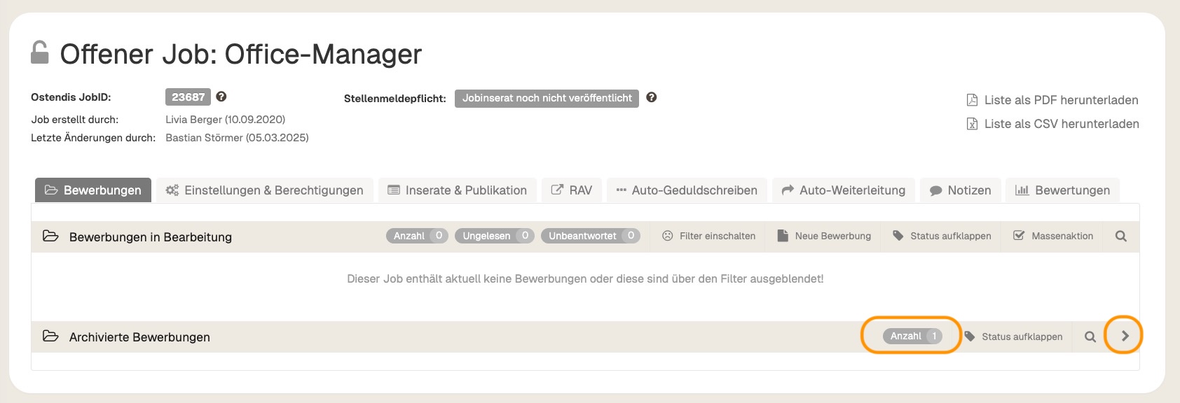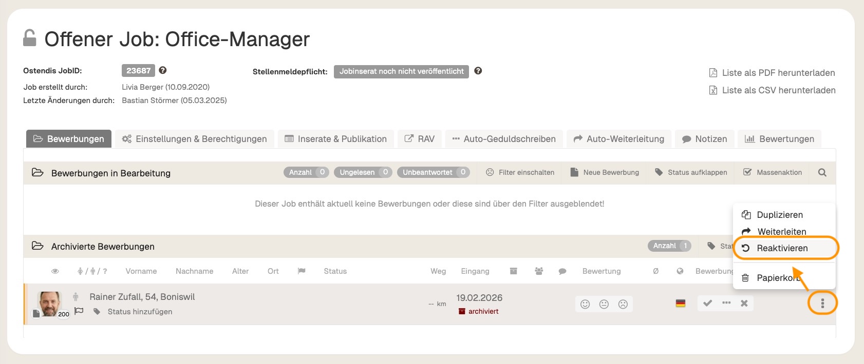 All existing applications are retained but remain archived. You can recognize this by the number of applications in the job. If you want to actively process an archived application again, you can click on the three dots next to the respective candidate and select “Reactivate”. This will remove the application from the archive and display it again in the active application process.