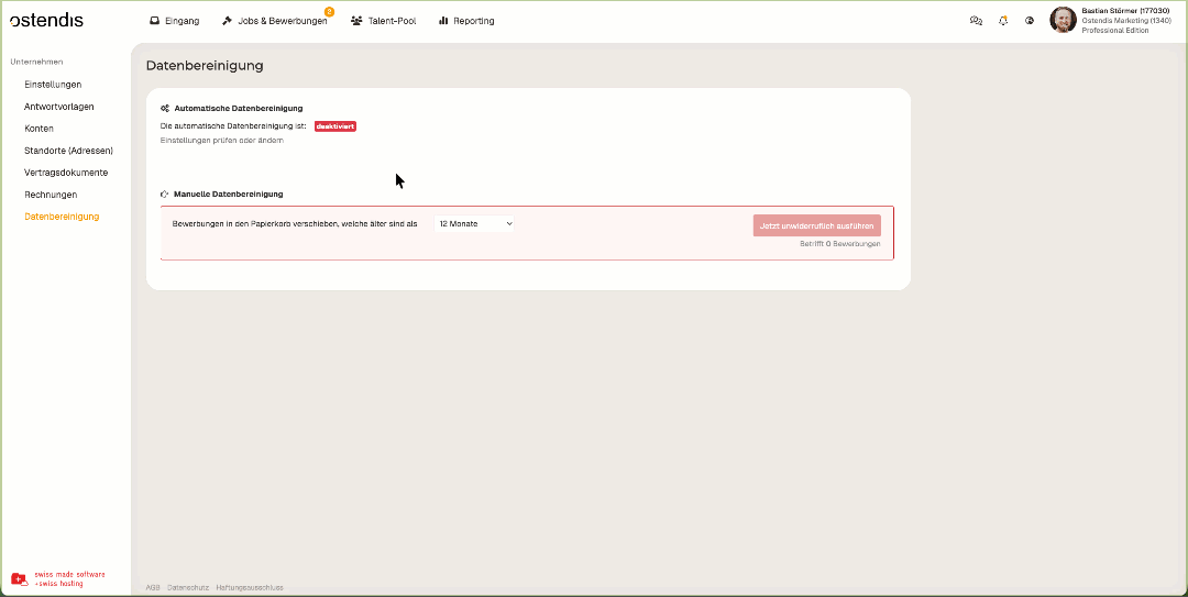 In Ostendis, application files – whether archived or still in a job – remain until you deliberately delete them manually via data cleanup. Ostendis never automatically deletes applications without your intervention.