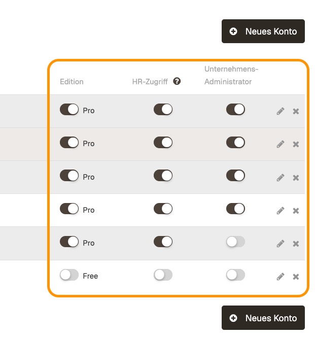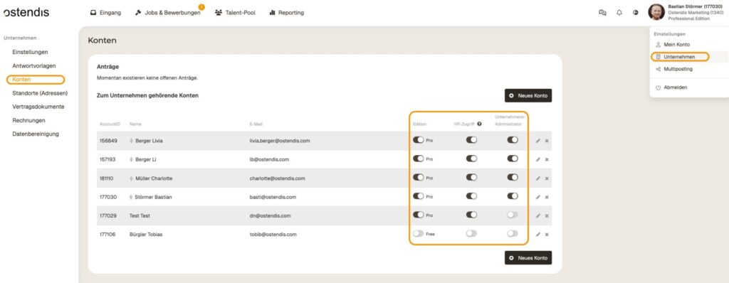 Come amministratore aziendale, puoi controllare quali permessi ricevono gli account Ostendis nella tua azienda. Vai su “Azienda” > “Account”, dove puoi impostare le autorizzazioni desiderate per ogni account.