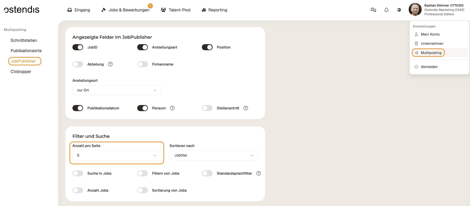 Per definire quante posizioni aperte vengono visualizzate per pagina sul sito web della tua azienda, vai su Mulitposting > JobPublisher e scorri fino alla sezione “Filtri e ricerca”. Lì trovi l’opzione “Numero per pagina”, dove puoi impostare la quantità desiderata.