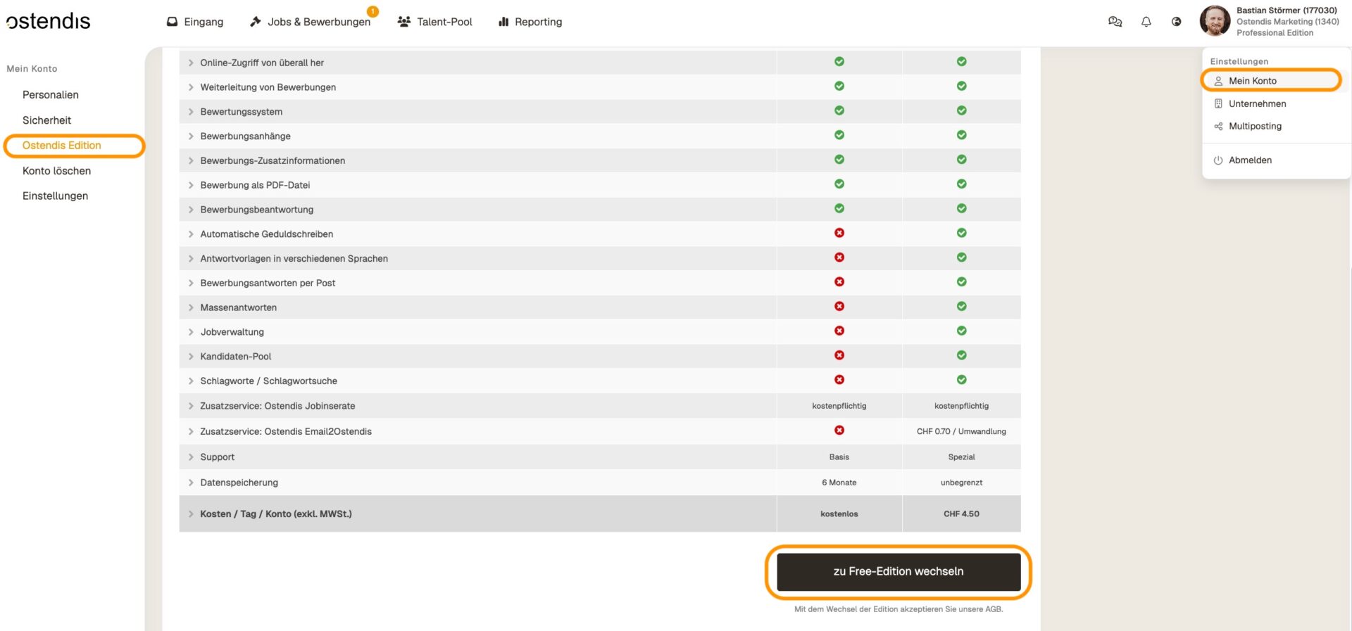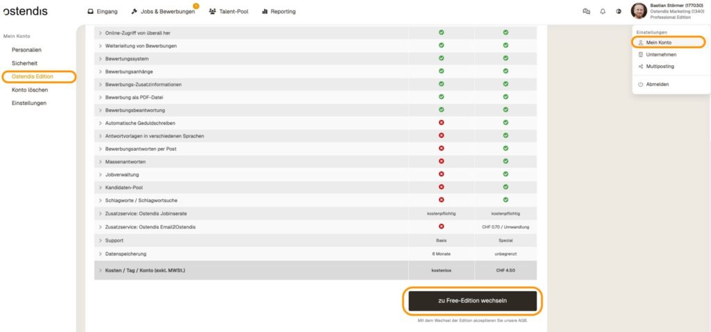 Nel tuo account, vai su “Il mio account” in alto e seleziona “Ostendis Edition”. Scorri verso il basso fino a visualizzare il pulsante “Passa a Professional-Edition”. Cliccaci sopra per convertire il tuo account in Pro. Il processo inverso funziona naturalmente allo stesso modo.