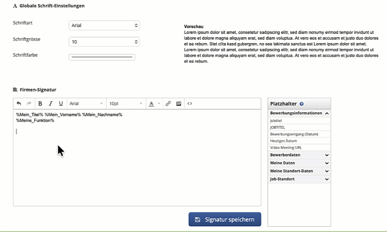 Bei der Unternehmenssignatur empfehlen wir mit den Platzhaltern zu arbeiten, die rechts daneben zu finden sind. So können bei mehreren HR-Konten die Signatur automatisch dem jeweiligen Nutzer angeglichen werden.