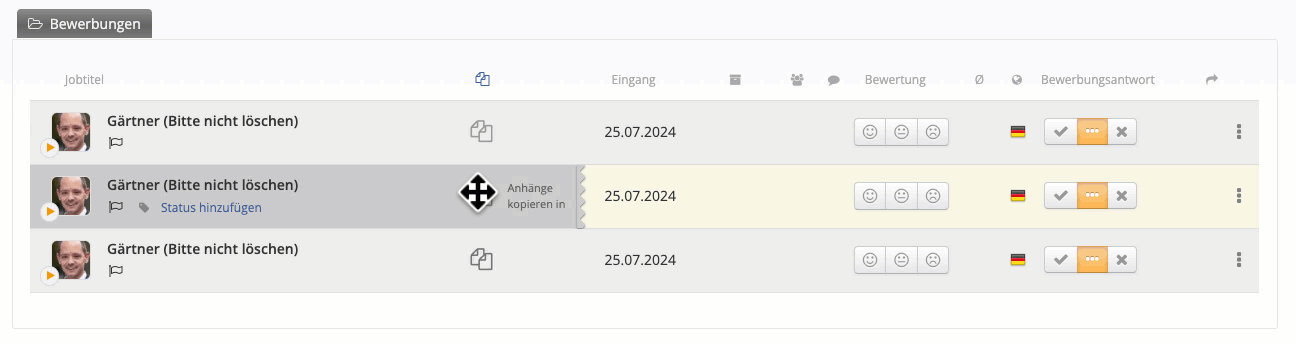 Fahre nun bei der Bewerbung, die die Anhänge enthält, mit der Maus über das Symbol mit den zwei Dokumenten (nicht anklicken!). Es erscheint ein grauer Balken mit dem Text „Anhänge kopieren in“, und dein Mauszeiger verwandelt sich in ein Kreuzsymbol mit vier Pfeilen.