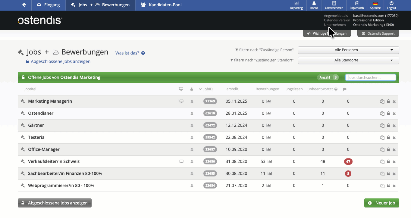 In Ostendis bleiben Bewerbungsdossiers – egal ob archiviert oder noch in einem Job – so lange bestehen, bis du sie über die Datenbereinigung bewusst manuell löschst. Ostendis löscht also niemals automatisch und ohne dein Zutun Bewerbungen.